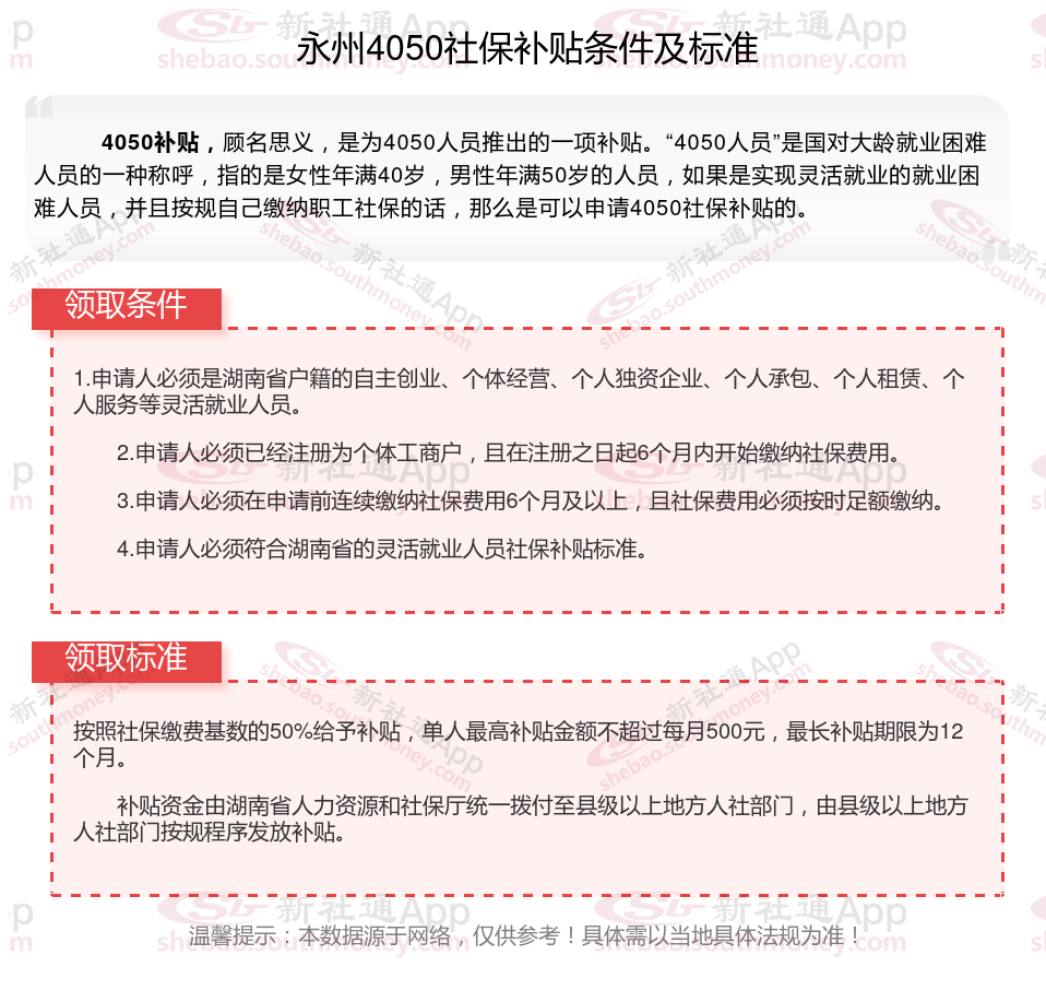 今天聊一下4050补贴话题。4050补贴听起来像是一个针对特定年龄人群的社保补贴。比如女性需年满40周岁,男性需年满50周岁(以申请当年12月31日为截止日期)。那么永州4050灵活就业社保补贴标准是多少钱?永州4050社保补贴条件是什么?接下来随新社通APP小编了解一下最新资讯。