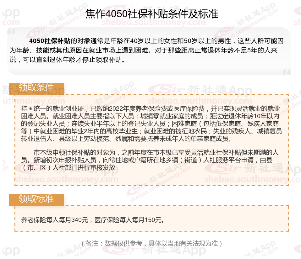 一、2025年焦作灵活就业4050社保补贴标准和条件是什么