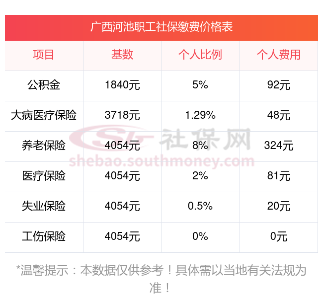 2025年广西河池社保缴费价格表最新消息?广西河池社保交多少钱一个月?下表是2024-2025年广西河池社保费用明细参考,新社通app-社保缴费查询工具提供的最新数据如下: