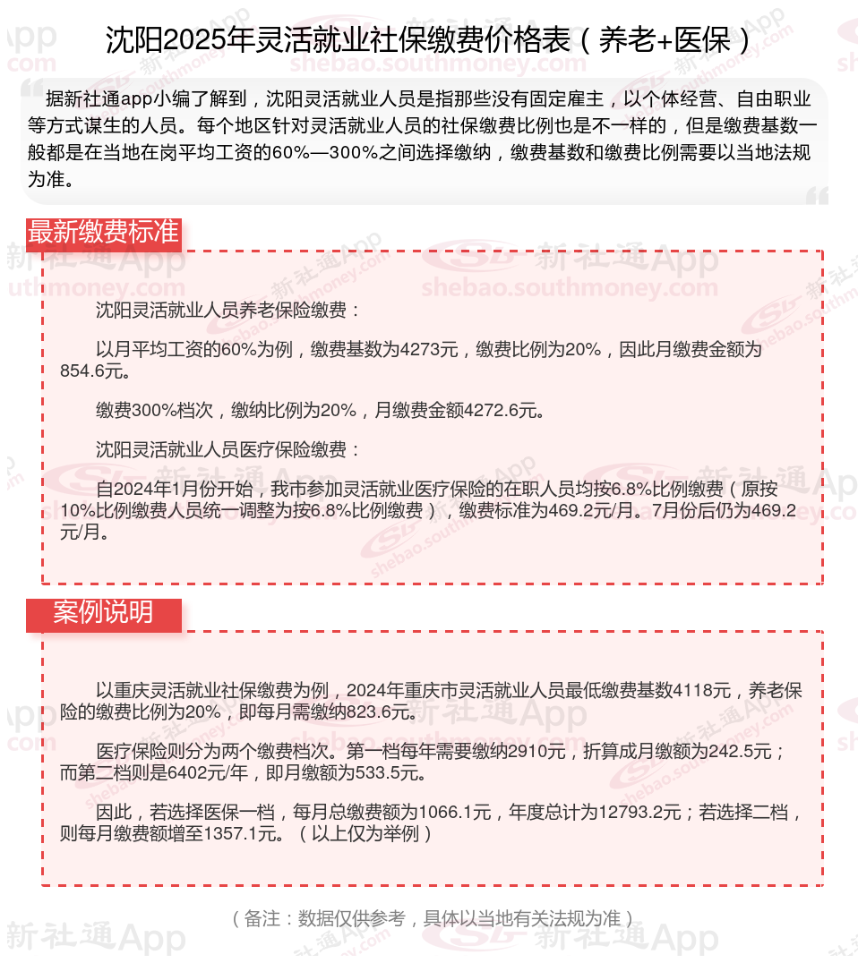 接下来了解一下,沈阳灵活就业人员社保缴费标准是多少?退休能领多少钱呢?根据新社通app-社保缴费查询工具提供的2025社保缴费标准详情数据: