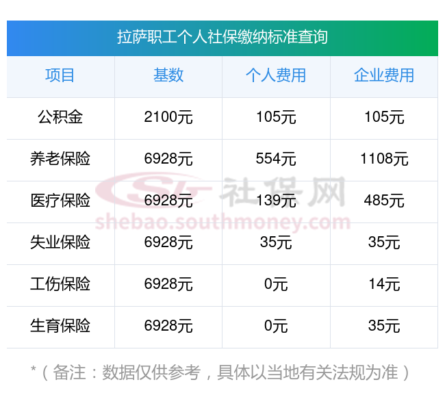 2025年拉萨社保缴费多少钱?下表是2024-2025年拉萨社保费用明细参考,新社通app-社保缴费查询工具提供的最新数据如下: