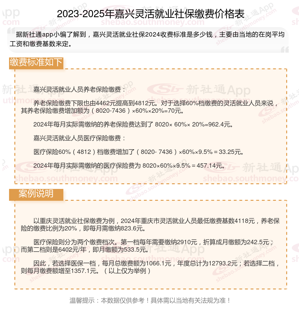 嘉兴社保缴费多少钱?下表是2024-2025年嘉兴社保费用明细参考,根据新社通app-社保缴费查询工具提供的最新数据如下: