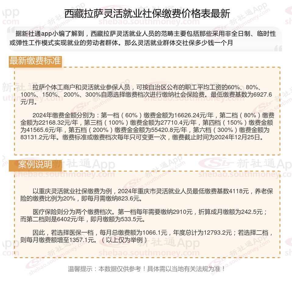 2025西藏拉萨灵活就业社保缴费价格是多少钱一个月?根据新社通app-社保缴费查询工具提供的最新数据如下: