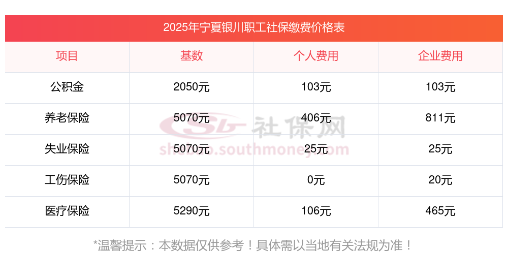 宁夏银川五险一金交多少钱一个月?下表是2024-2025年宁夏银川社保费用明细参考,新社通app-社保缴费查询工具提供的最新数据如下: