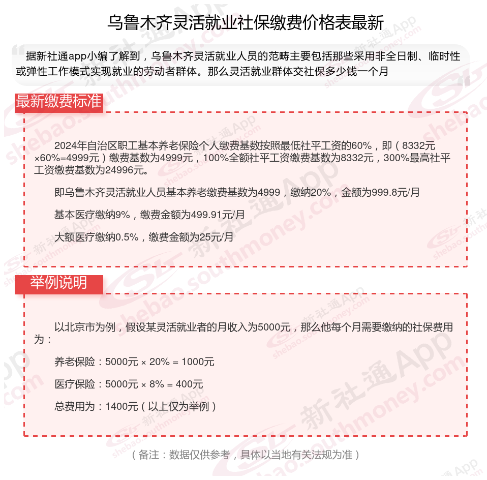 即乌鲁木齐灵活就业人员基本养老缴费基数为4999,缴纳20%,金额为999.8元/月