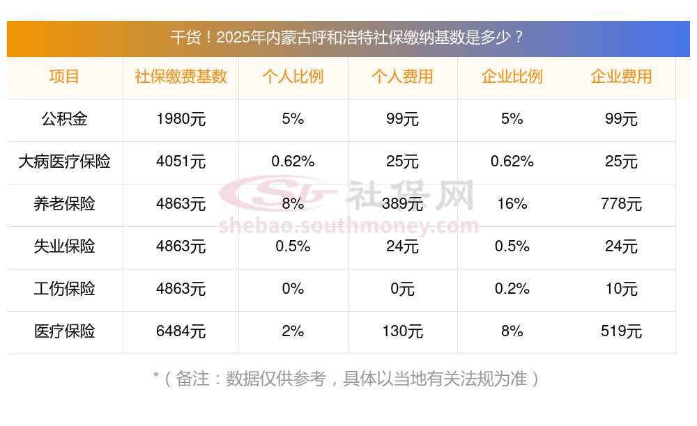 2025社保交多少钱?下表是2025年内蒙古呼和浩特社保费用明细参考,新社通app-社保缴费查询工具提供的最新数据如下: