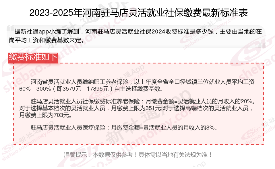 据新社通app数据显示,河南驻马店灵活就业养老保险缴费基数2024-2025年最新标准如下: