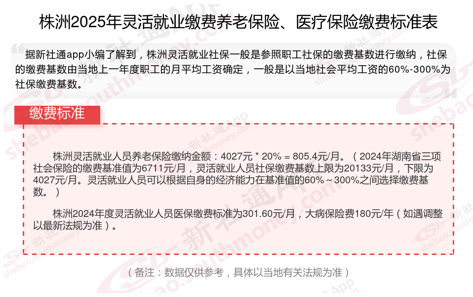据新社通app数据显示,株洲灵活就业养老保险的缴费基数为:4027元。灵活就业人员参保缴费的比例为个人20%。