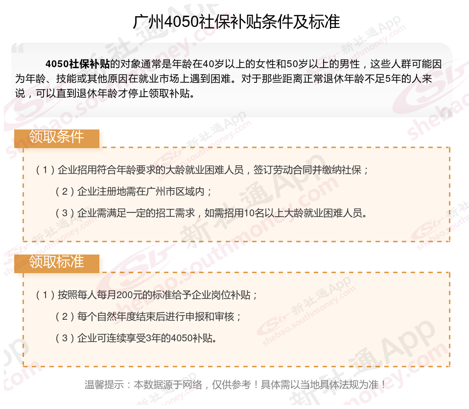 二、2025年广州4050社保补贴标准及条件,最新如下: