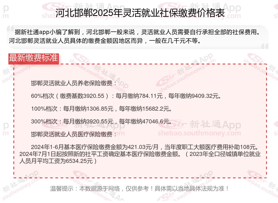 接下来了解一下,河北邯郸灵活就业人员社保缴费标准是多少?退休能领多少钱呢?根据新社通app-社保缴费查询工具提供的2025社保缴费标准详情数据: