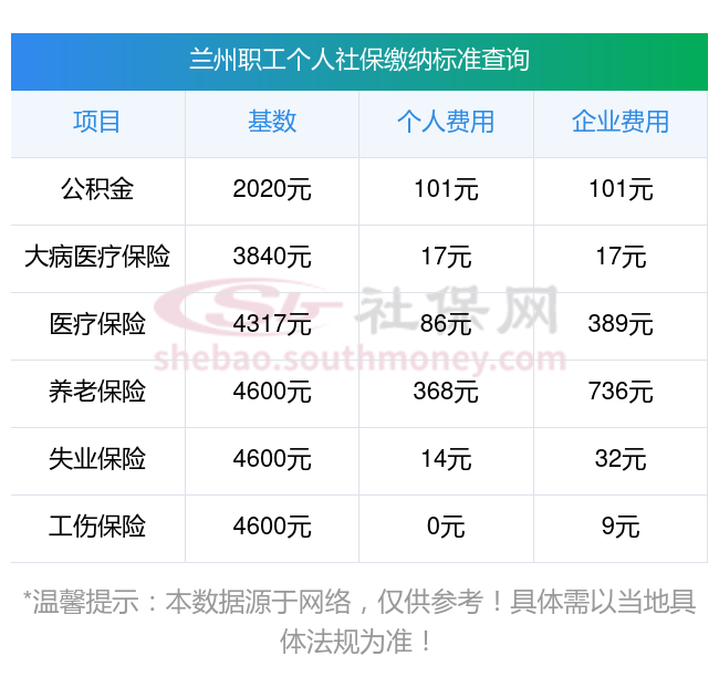 2025年兰州五险缴费标准是多少,2025年兰州社保缴费多少钱?下表是2025年兰州社保费用明细参考,新社通app-社保缴费查询工具提供的最新数据如下: