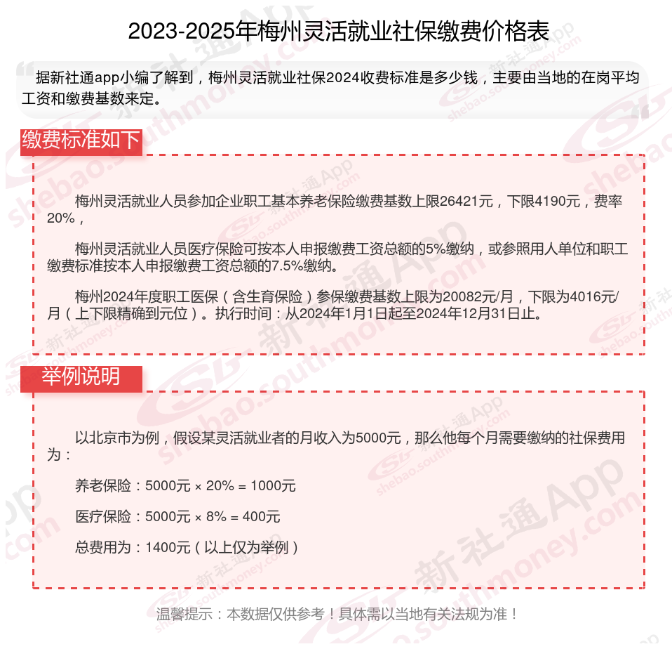 那么,梅州灵活就业人员社保交多少钱?买根据新社通app-社保缴费查询工具提供的2025社保缴费标准详情数据: