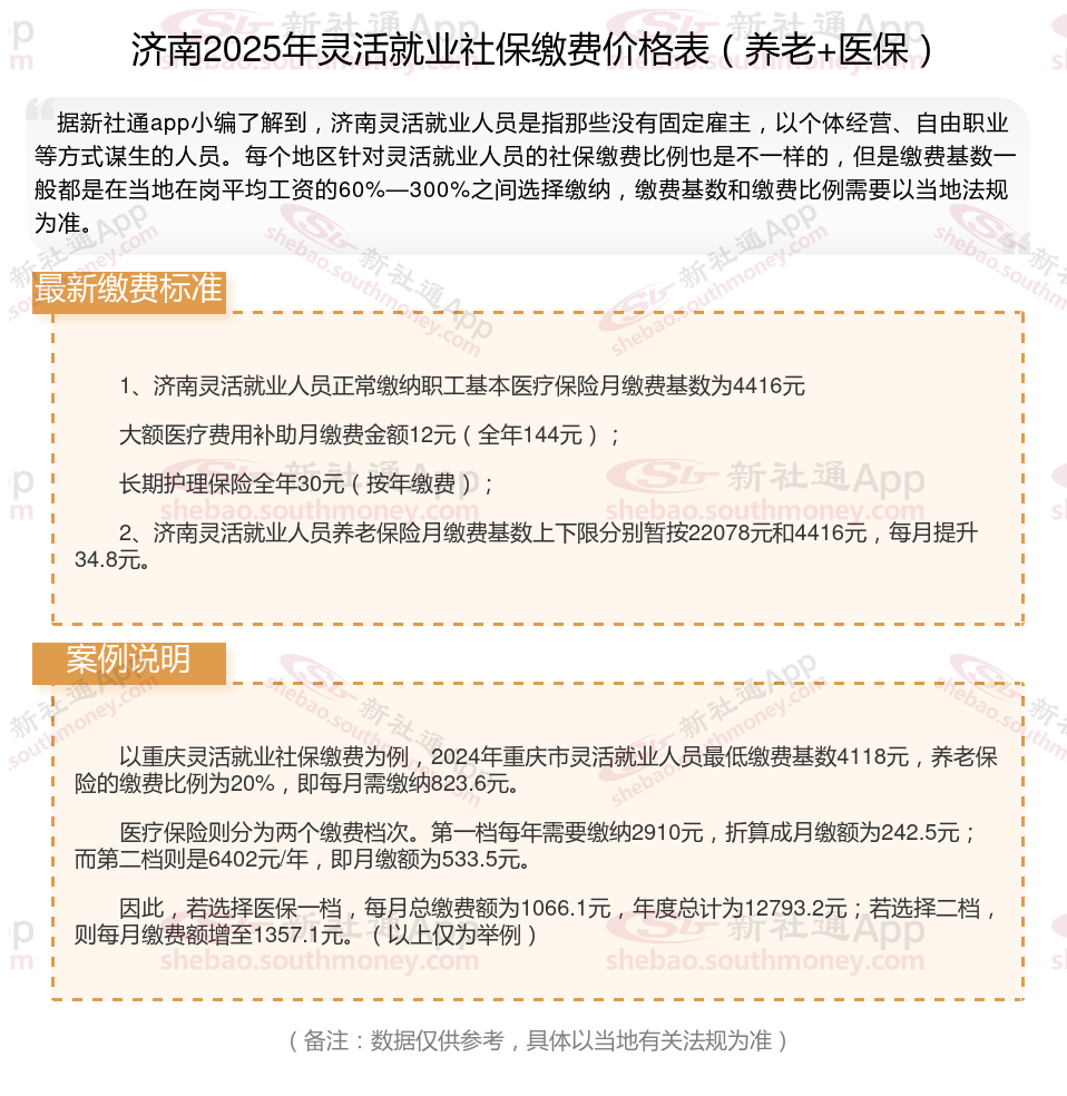 据新社通app数据显示,济南灵活就业人员养老缴费基数2024-2025年最新标准如下: