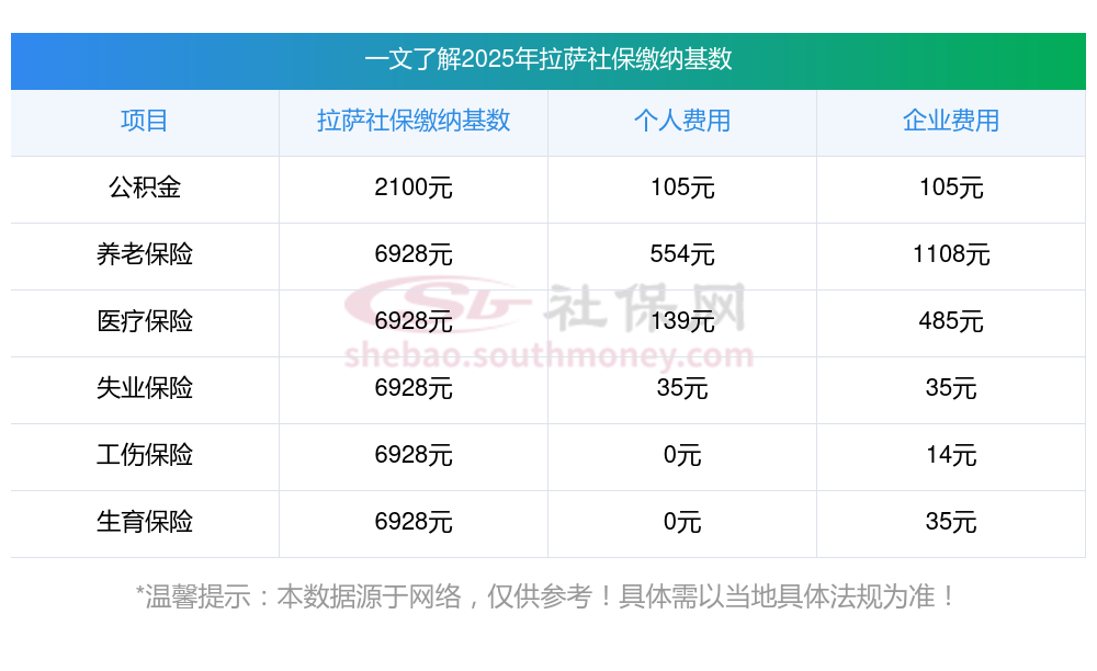 拉萨社保个人缴费比例是多少?和社保君一起来看看2024-2025年拉萨最低社保费用明细参考,新社通app-社保缴费查询工具提供的最新数据如下: