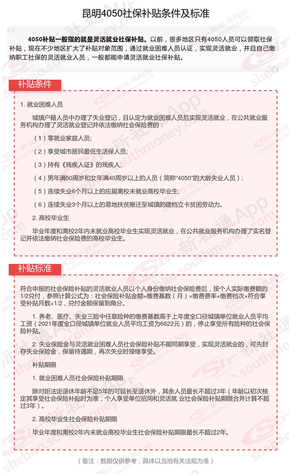 二、2025年昆明4050社保补贴标准及条件(4050社保补贴多少钱?)