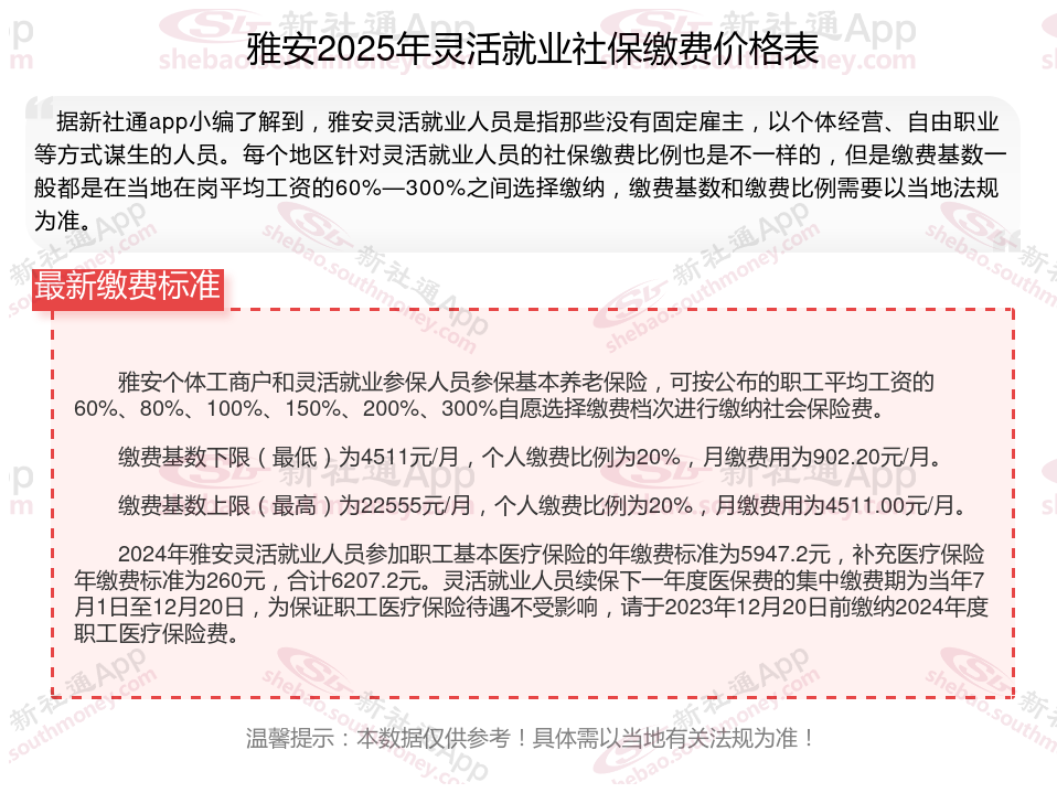 以上就是雅安灵活就业社保缴费的全部内容,数据及内容供参考!希望对你有帮助,欢迎关注新社通解锁更多社保专业资讯。