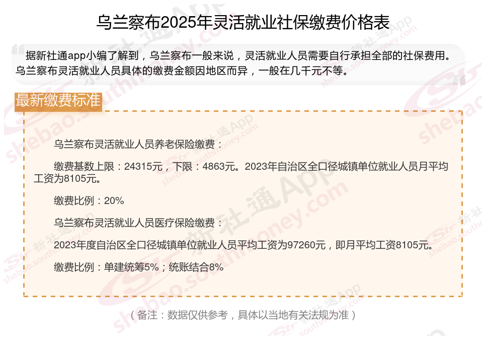 据新社通app数据显示,乌兰察布灵活就业养老保险最低缴费基数为:4863元;个人的缴费比例分别为:20%;