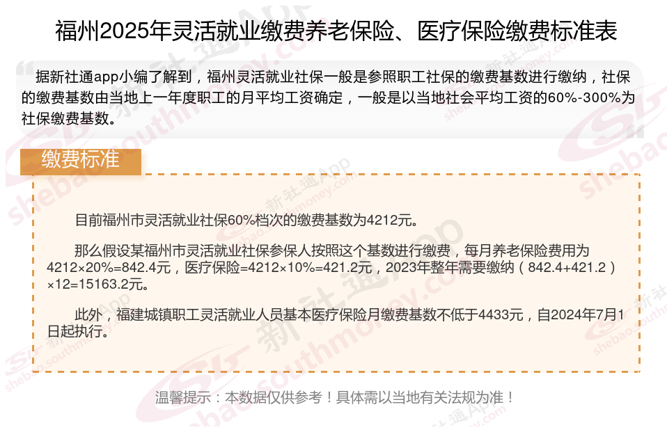 据新社通app数据显示,2024-2025年福州灵活就业人员养老保险的缴费标准是根据缴费基数来确定的: