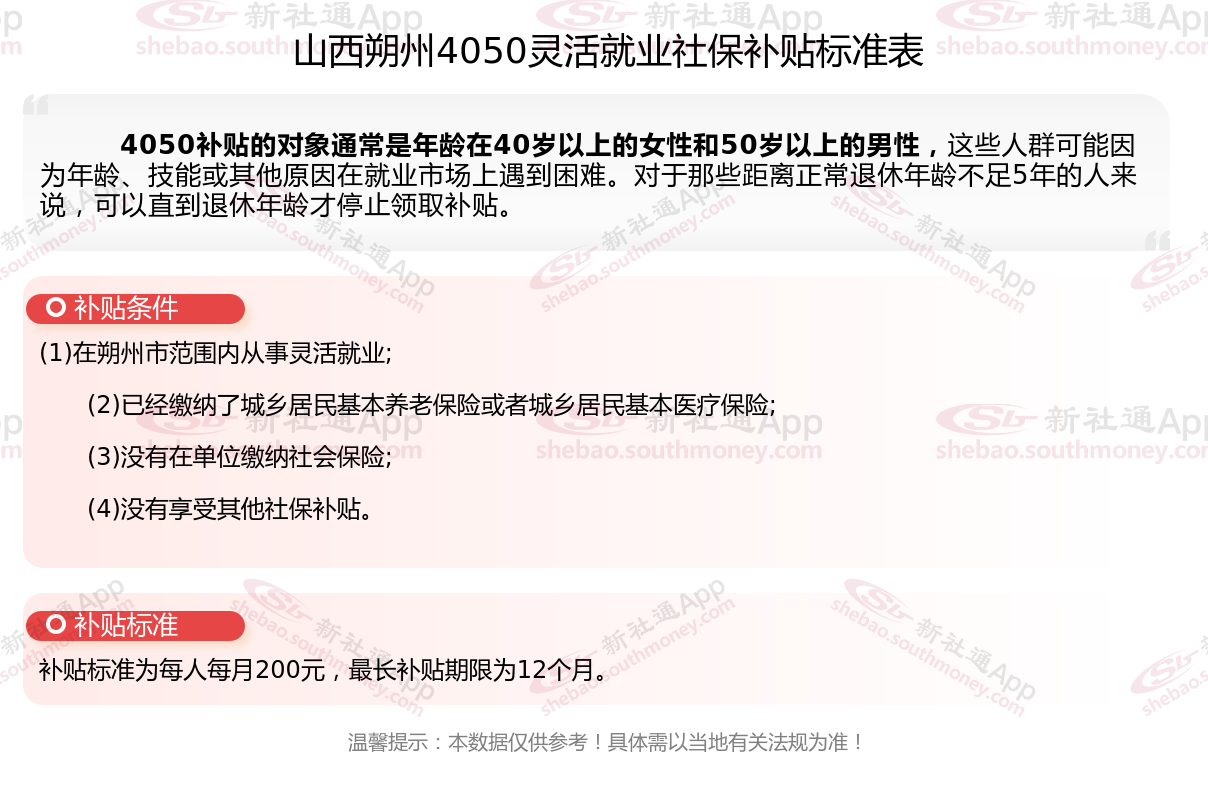 二、2025年山西朔州4050社保补贴标准及条件,最新如下: