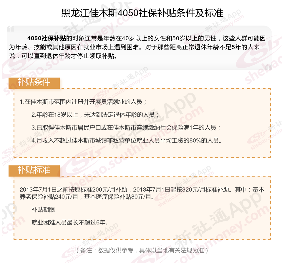 黑龙江佳木斯4050灵活就业社保补贴是什么?今天聊一下4050补贴话题。44050社保补贴标准据新社通app小编了解,通常,4050社保补贴包含基本医疗保险和基本养老保险两个险种,社保补贴金额为申请人实际缴纳基本养老保险和基本医疗保险金额的2/3,具体标准以当地社保局公布的数据为准!那么黑龙江佳木斯4050灵活就业社保补贴标准是多少钱?黑龙江佳木斯4050社保补贴可以领取多少?接下来随新社通APP小编了解一下黑龙江佳木斯4050灵活就业社保补贴的最新资讯。