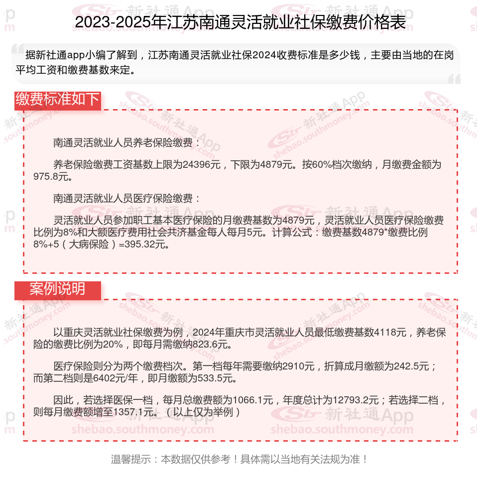 江苏南通社保缴费多少钱?下表是2024-2025年江苏南通社保费用明细参考,根据新社通app-社保缴费查询工具提供的最新数据如下: