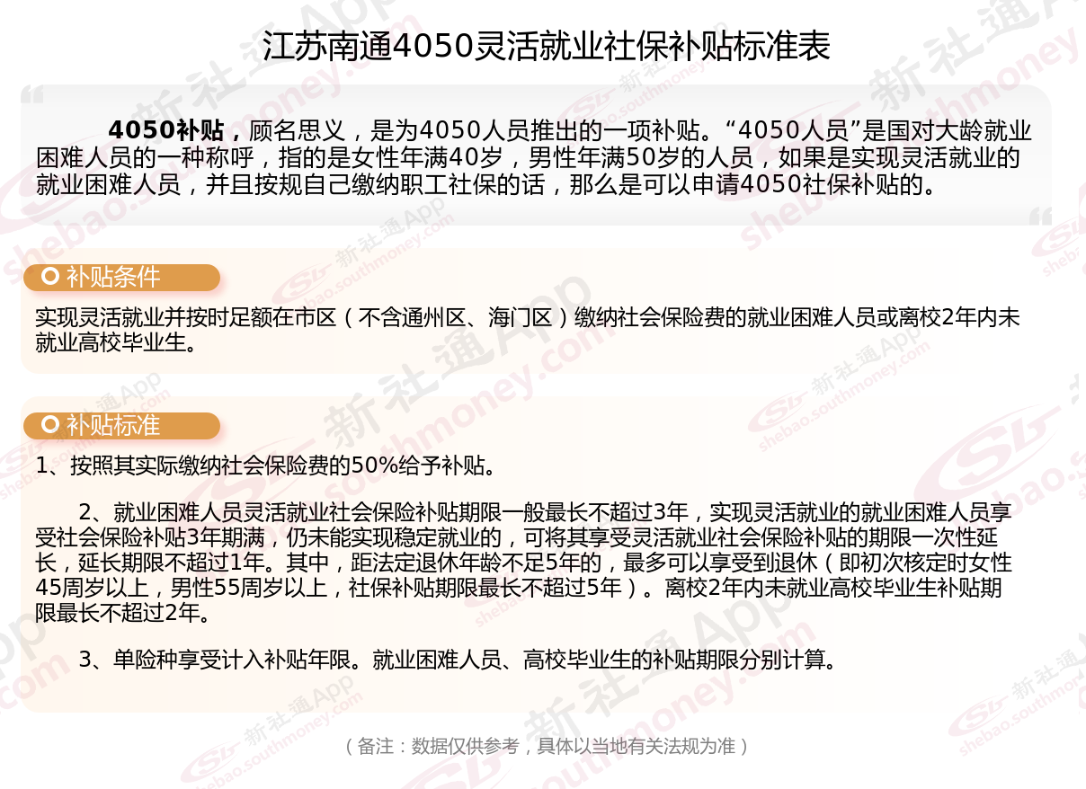 2025江苏南通灵活就业4050社保补贴是一项面向特定年龄段的就业困难人群的社会保险补贴。