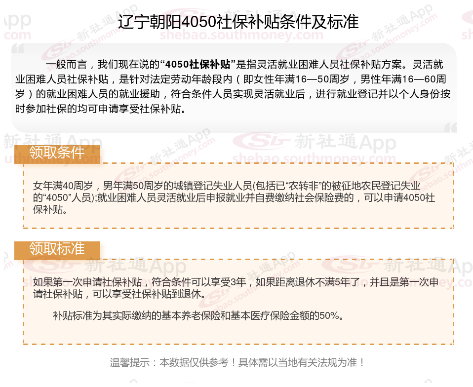 今天聊一下4050补贴的相关内容。4050补贴听起来像是一个针对特定年龄人群的社保补贴。比如女性需年满40周岁,男性需年满50周岁(以申请当年12月31日为截止日期)。那么辽宁朝阳4050灵活就业困难人员社保补贴多少钱?辽宁朝阳4050社保补贴可以申请吗?接下来随新社通APP小编具体了解一下4050社保补贴内容。