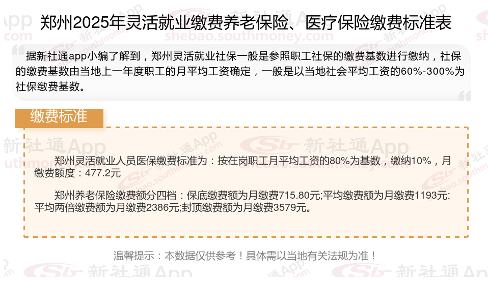 那么,灵活就业人员社保是多少钱一个月 郑州灵活社保交多少钱?根据新社通app-社保缴费查询工具提供的2025社保缴费标准详情数据: