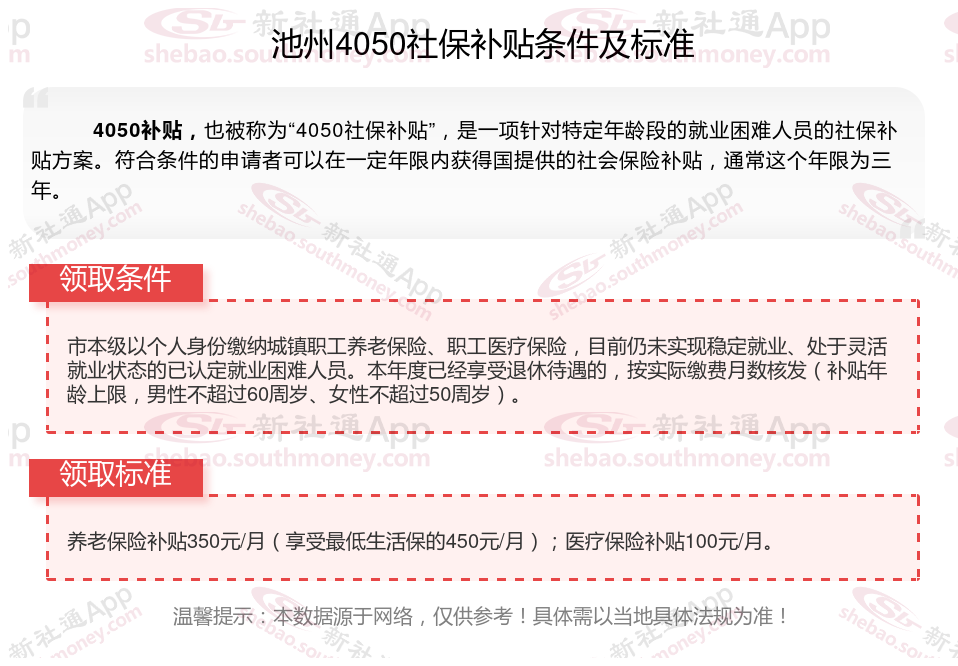 “灵活就业4050社保补贴”需要以灵活就业身份参加职工养老和医疗保险,补贴标准不超过实际缴费的三分之二,最长3年,距离退休不足5年的可延长到退休。补贴对象包括国企下岗人员、低保家庭等。申请流程需要提交身份证、银行账户等。那么池州4050灵活就业困难人员社保补贴标准是多少?池州4050社保补贴需要符合什么条件?接下来随新社通APP小编具体了解一下4050社保补贴内容。