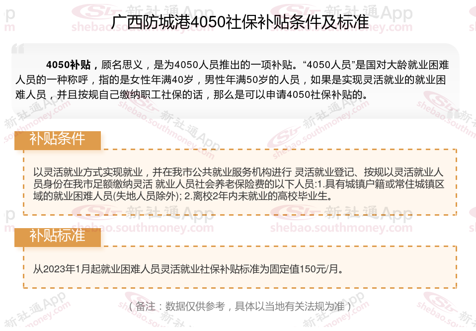 广西防城港4050灵活就业社保补贴是什么?今天聊一下4050补贴话题。4050补贴听起来像是一个针对特定年龄人群的社保补贴。比如女性需年满40周岁,男性需年满50周岁(以申请当年12月31日为截止日期)。那么广西防城港4050灵活就业社保补贴标准是多少钱?广西防城港4050社保补贴可以领取多少?接下来随新社通APP小编了解一下广西防城港4050灵活就业社保补贴的最新资讯。