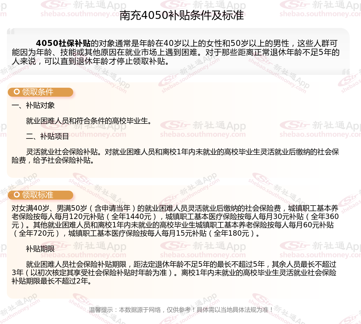 2025南充4050补贴主要针对的是年龄在40岁以上的女性和50岁以上的男性,这些人群通常因为年龄较大而面临就业困难。