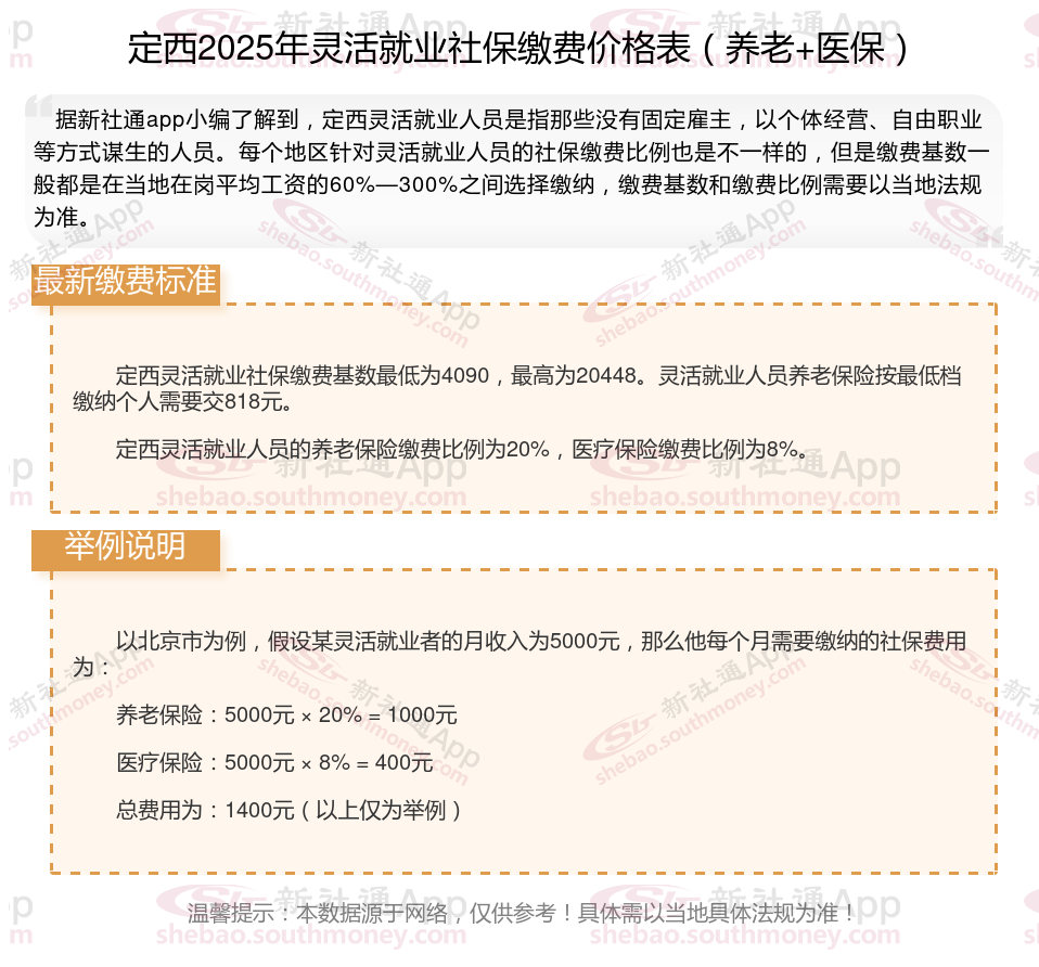 定西灵活就业人员的养老保险缴费比例为20%,医疗保险缴费比例为8%。
