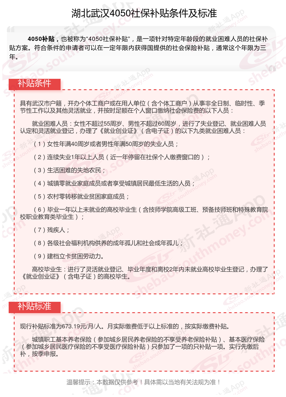 一、湖北武汉4050社保补贴标准及条件是多少?