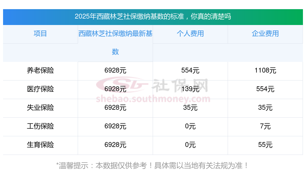 西藏林芝社保多少钱一个月?下面和新社君一起来看看西藏林芝最低标准社保费用明细参考,新社通app-社保缴费查询工具提供的最新数据如下: