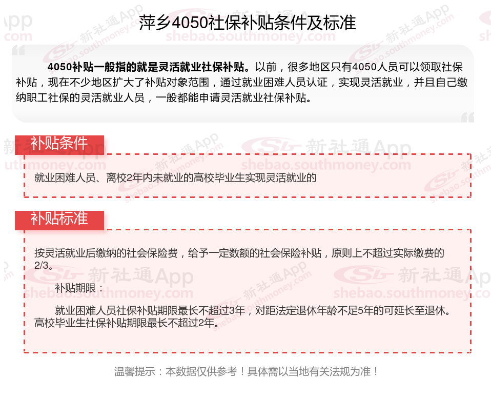 一、萍乡4050社保补贴标准及条件2025年最新消息