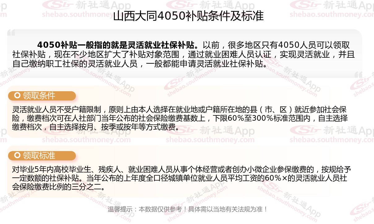 二、2025年山西大同4050社保补贴标准及条件,最新如下: