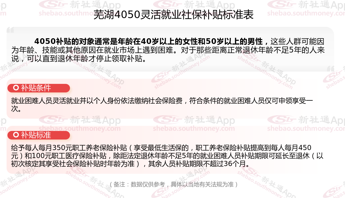 芜湖4050社保补贴多少钱一个月?芜湖4050社保补贴2025年最新标准是多少?2025芜湖4050补贴主要针对的是年龄在40岁以上的女性和50岁以上的男性,这些人群通常因为年龄较大而面临就业困难。