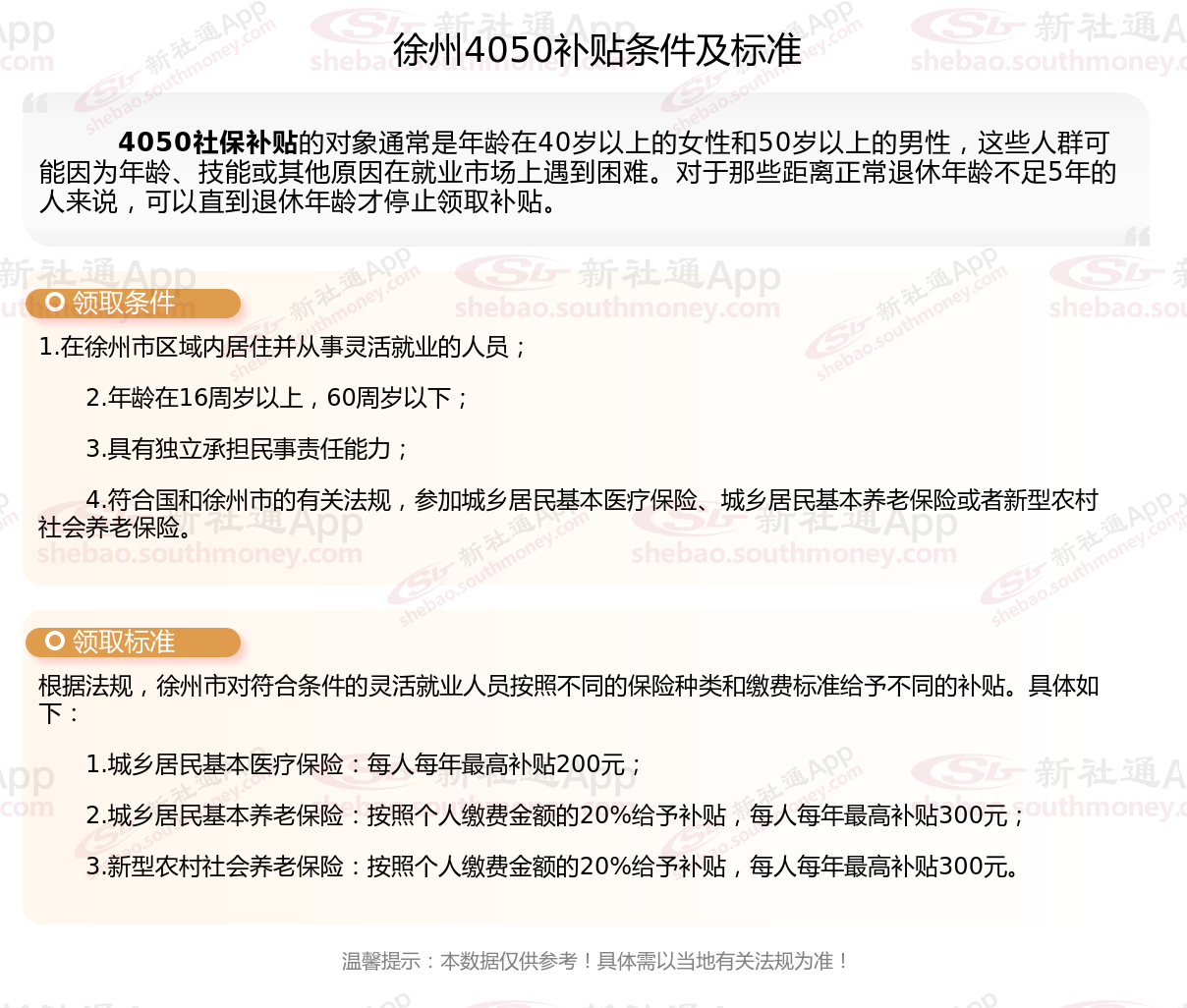 一、2025年徐州灵活就业4050社保补贴标准和条件是什么
