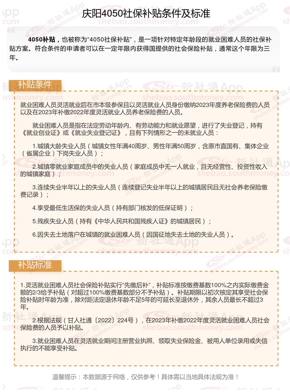 一、2023-2024年庆阳4050社保补贴标准及条件