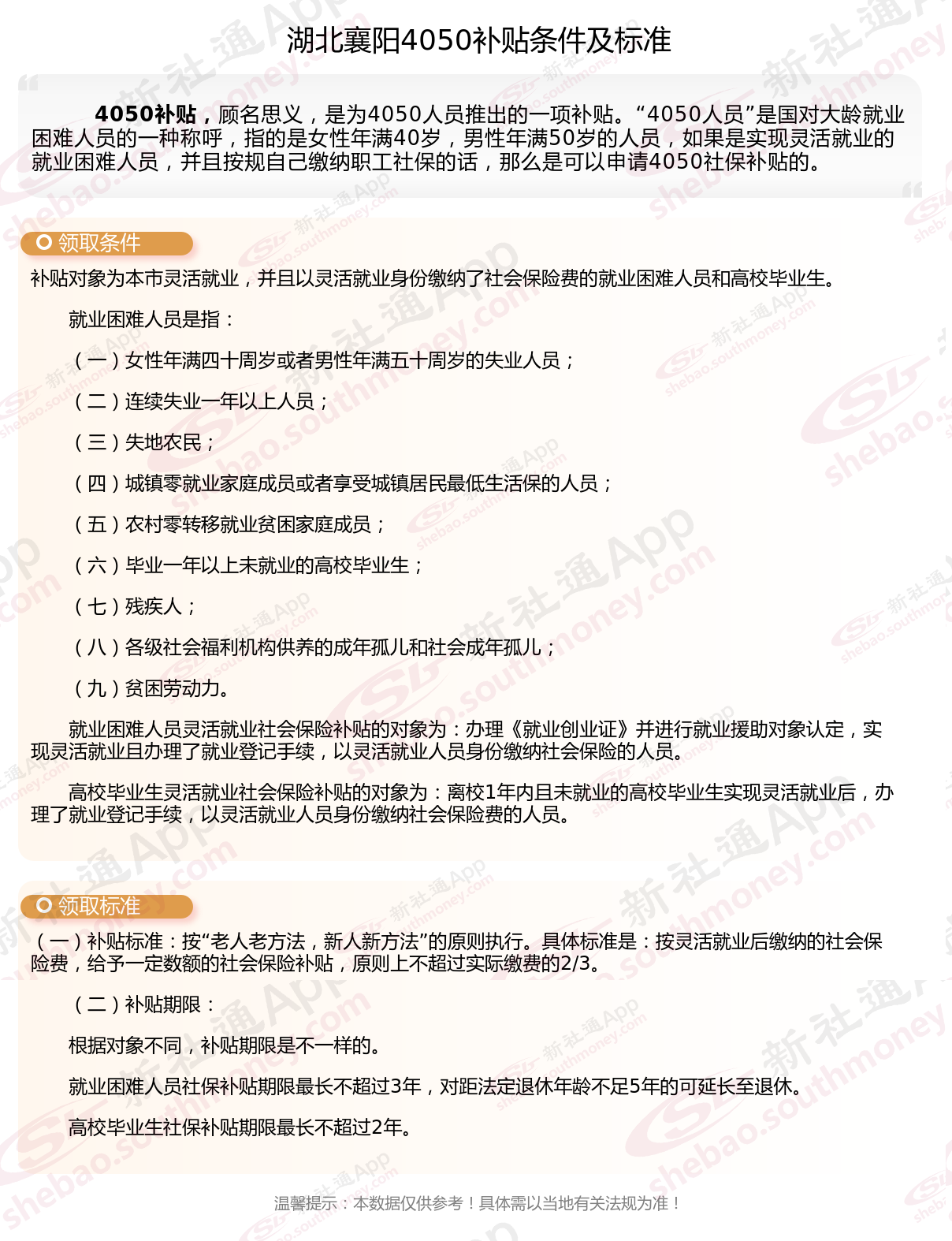 二、2025年湖北襄阳4050社保补贴标准及条件