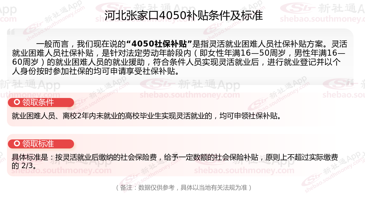 4050社保补贴标准据新社通app小编了解,通常,4050社保补贴包含基本医疗保险和基本养老保险两个险种,社保补贴金额为申请人实际缴纳基本养老保险和基本医疗保险金额的2/3,具体标准以当地社保局公布的数据为准!那么河北张家口4050灵活就业困难人员社保补贴标准是多少?河北张家口4050社保补贴需要符合什么条件?接下来随新社通APP小编具体了解一下4050社保补贴内容。