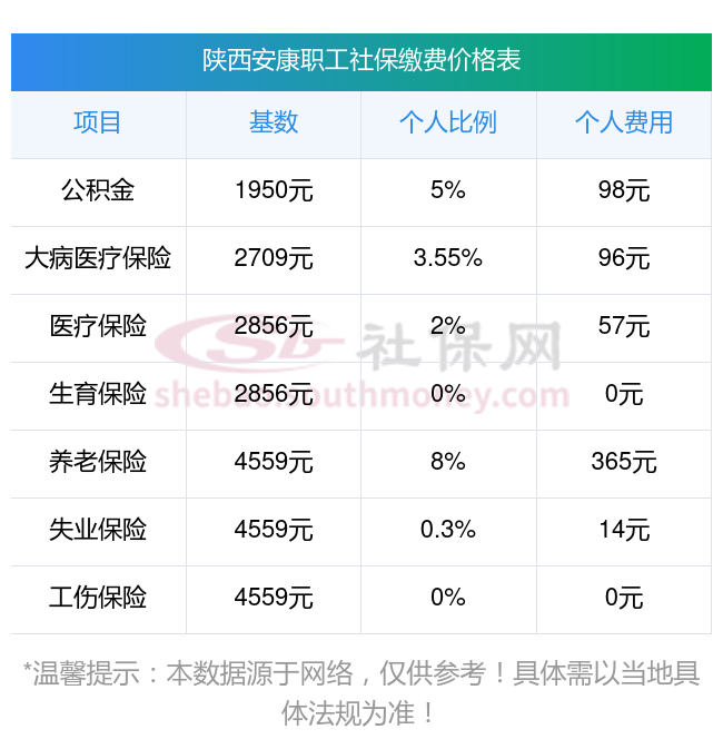 2025年陕西安康社保缴费最低基数及个人和单位具体是多少钱?下表是2025年陕西安康社保费用明细参考,新社通app-社保缴费查询工具提供的最新数据如下: