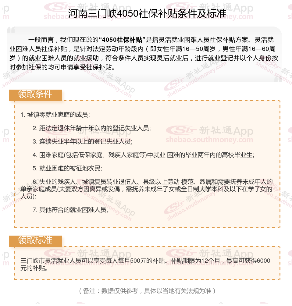 一、2023-2024年河南三门峡4050社保补贴标准及条件