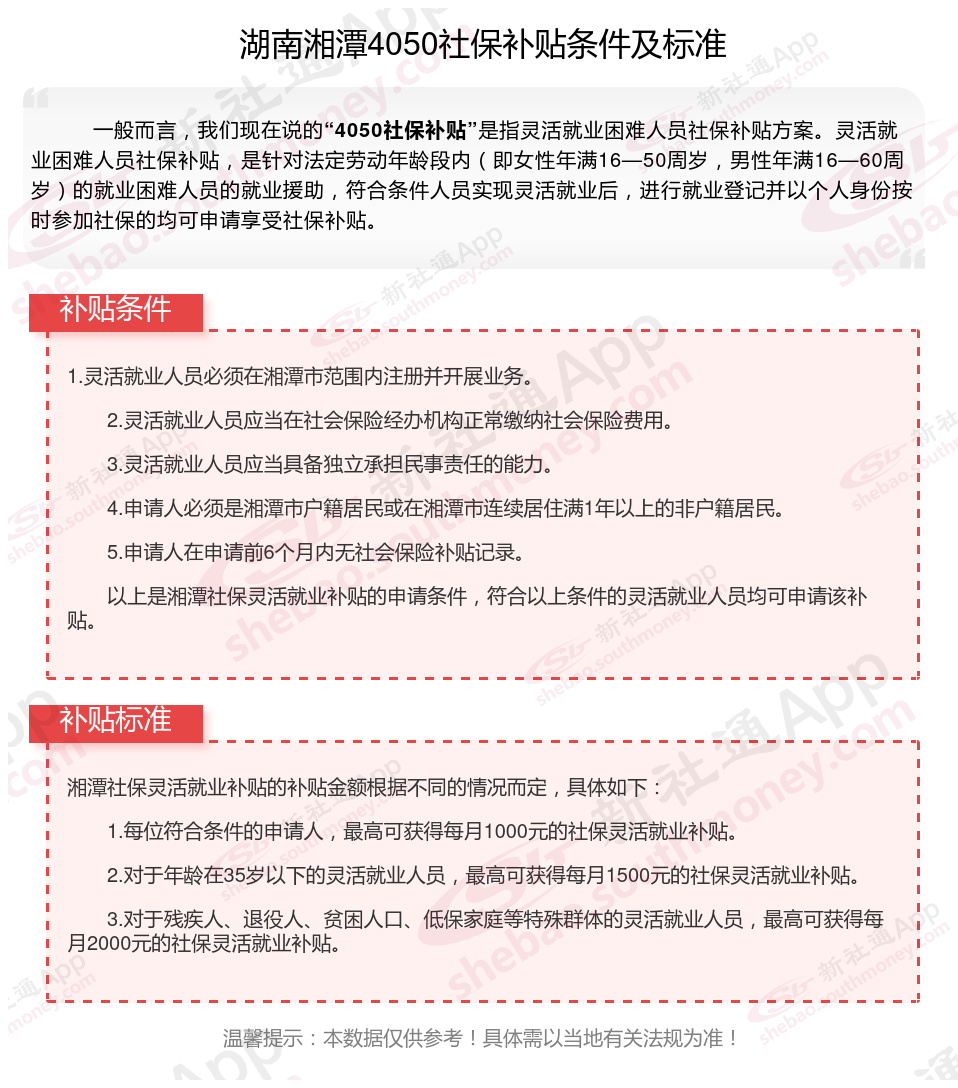 湖南湘潭4050灵活就业社保补贴标准如何?“4050补贴”主要是针对大龄就业困难人群的社保补贴,申请条件包括年龄、就业困难、灵活就业并自费缴纳社保,需要持有失业登记证,不同地区可能有细微差别,比如农村户口的限制。那么湖南湘潭4050灵活就业社保补贴标准是多少钱?湖南湘潭4050社保补贴条件是什么?接下来随新社通APP小编了解一下湖南湘潭4050灵活就业社保补贴标准最新资讯。