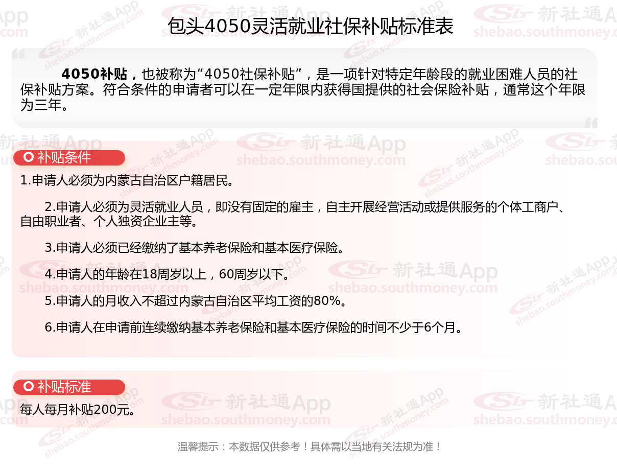 4050社保补贴标准据新社通app小编了解,通常,4050社保补贴包含基本医疗保险和基本养老保险两个险种,社保补贴金额为申请人实际缴纳基本养老保险和基本医疗保险金额的2/3,具体标准以当地社保局公布的数据为准!那么包头4050灵活就业困难人员社保补贴标准是多少?包头4050社保补贴需要符合什么条件?接下来随新社通APP小编具体了解一下4050社保补贴内容。