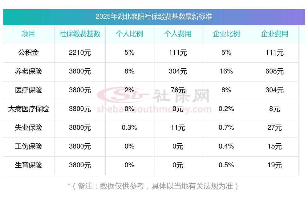 2025年湖北襄阳5险缴费标准,2025年湖北襄阳社保缴费多少钱?下表是2025年湖北襄阳社保费用明细参考,新社通app-社保缴费查询工具提供的最新数据如下:
