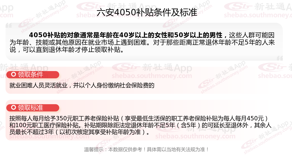 二、六安4050社保补贴标准及条件4050社保补贴,最新如下
