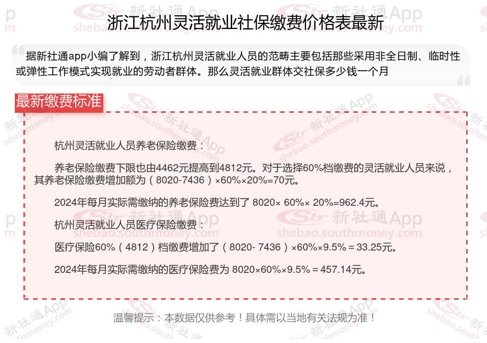 据新社通app数据显示,浙江杭州灵活就业养老保险的缴费基数为:4462元。灵活就业人员参保缴费的比例为个人20%。