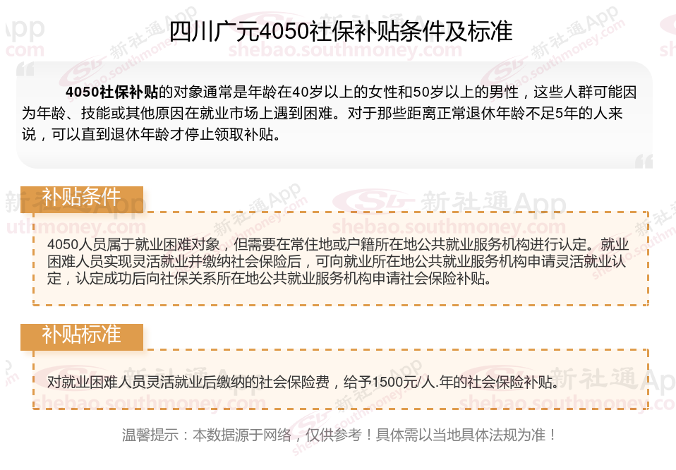 一、四川广元4050社保补贴标准是什么?附条件