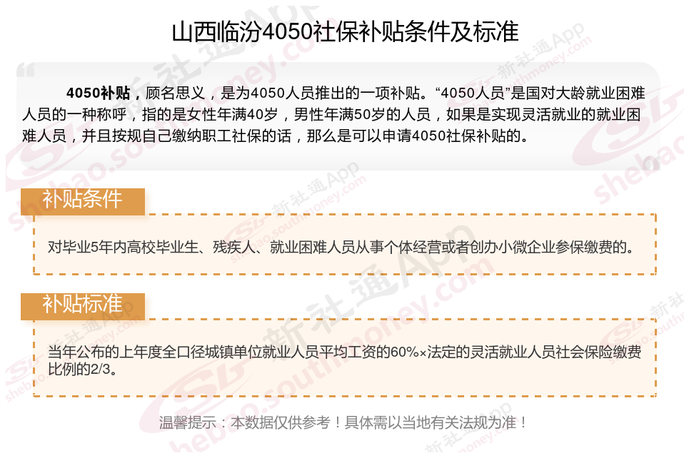 二、2025年山西临汾4050社保补贴标准及条件,最新如下: